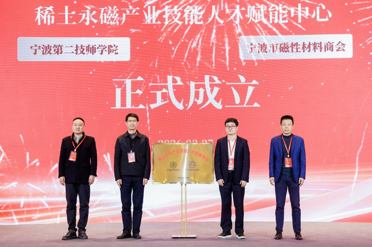 随后,宁波第二技师学院与宁波市磁性材料商会共同为企业导师颁发聘书,一批来自科研院所、行业龙头企业的技术专家受聘成为院校“企业导师”,开启校企协同育人新篇章。紧接着,由宁波市教育局、宁波市人社局、宁波第二技师学院、宁波市磁性材料商会联合发起的“稀土永磁产业技能人才赋能中心”正式成立,该中心旨在打造集人才培养、技能鉴定、技术研发于一体的综合性服务平台,为产业高质量发展提供强有力的技能人才支撑。