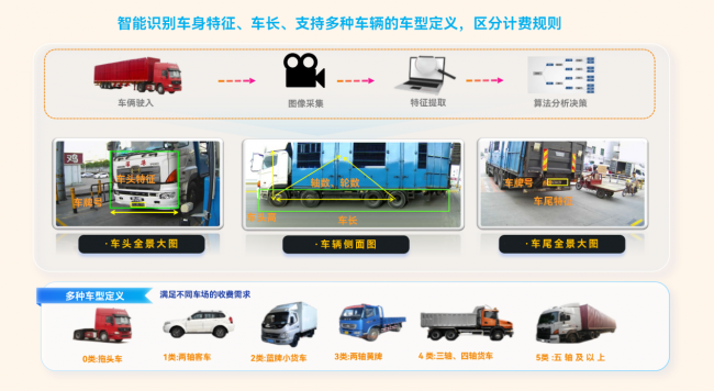 车型AI识别,精准计费无漏洞。传统方案仅识别车牌,难以区分拖头、挂车、箱货等不同车型,导致计费漏洞。捷顺车型识别一体机,通过车头、车侧、车尾三方位相机协同,精准识别车头特征、车身颜色、车辆长短、轴距、轴数等20余项特征,车型识别率≥98%。入场时,车牌与车型、车长信息自动绑定,匹配相应计费规则,彻底杜绝人工误判。