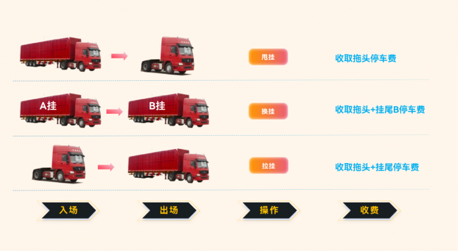 车挂分离识别,攻克甩挂计费难题。针对甩挂、换挂作业,系统支持拖头车与挂尾分开计费。出场时,云端坐席可远程确认车辆状态,判断甩挂、换挂、拉挂行为,收取对应停车费用,实现复杂场景的智能化结算。
