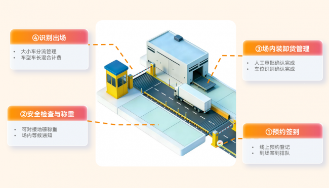 车辆管理复杂。重卡、挂车、普通货车混行,甩挂、换挂作业频繁,车头与挂车分离后身份识别难;普通货车进出频繁,人工登记效率低、易错漏;外来车辆管控难,乱停乱放影响园区周转。农批类园区更面临三轮车多、出入口多、跟车逃费频发的管理困境。