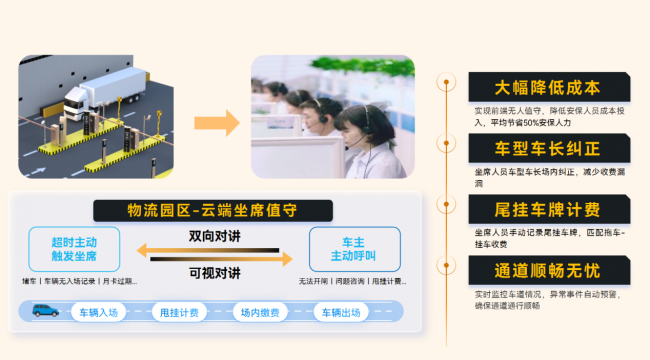 AI云端坐席,新人秒变专家。捷顺云托管服务,通过AI坐席助手,自动分析前端车道异常事件,智能引导坐席人员操作。坐席可远程进行车型车长纠正、尾挂车牌计费,实时监控车道情况。前端无需人员值守,安保人力成本平均降低50%以上。