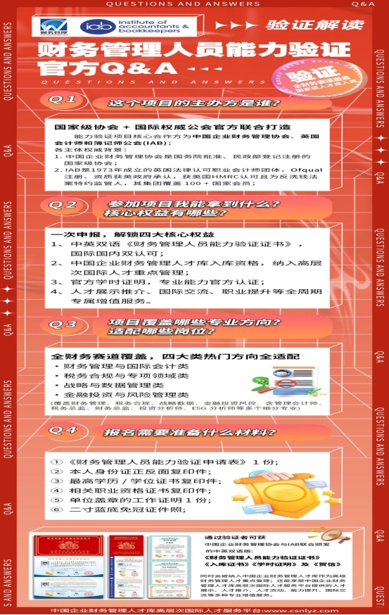 财务管理人员能力验证项目由中国企业财务管理协会与英国会计师和簿记师公会(IAB)联合打造,两大主体的权威背景为项目的专业性、公信力与国际化提供了坚实保障。