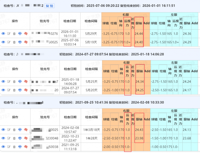 2024年7月第四次复查时,效果开始显现:小蕊右眼度数基本未增长,眼轴长度得到有效控制;左眼度数也趋于稳定。此后多次复查,双眼度数均保持稳定,右眼近视得到良好控制,左眼仅轻微增加25度,视功能正常,防控效果显著。