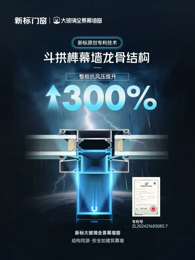 新标大玻璃全景幕墙窗以建筑幕墙级标准强化窗体结构,搭载新标独创专利技术斗拱榫钢卯窗体结构(专利号ZL202421685085.7),将幕墙局部使用的龙骨插芯款贯穿整个门窗主框,整框抗风压性能提升300%。运用90°钢卯幕墙拼框结构,让窗框拼接更严密、型材更坚固抗变形,大幅提升高层建筑及大玻璃门窗的承重抗压能力,真正实现建筑幕墙级的稳固可靠,直面雷暴大风与冰雹冲击依旧安然无恙。