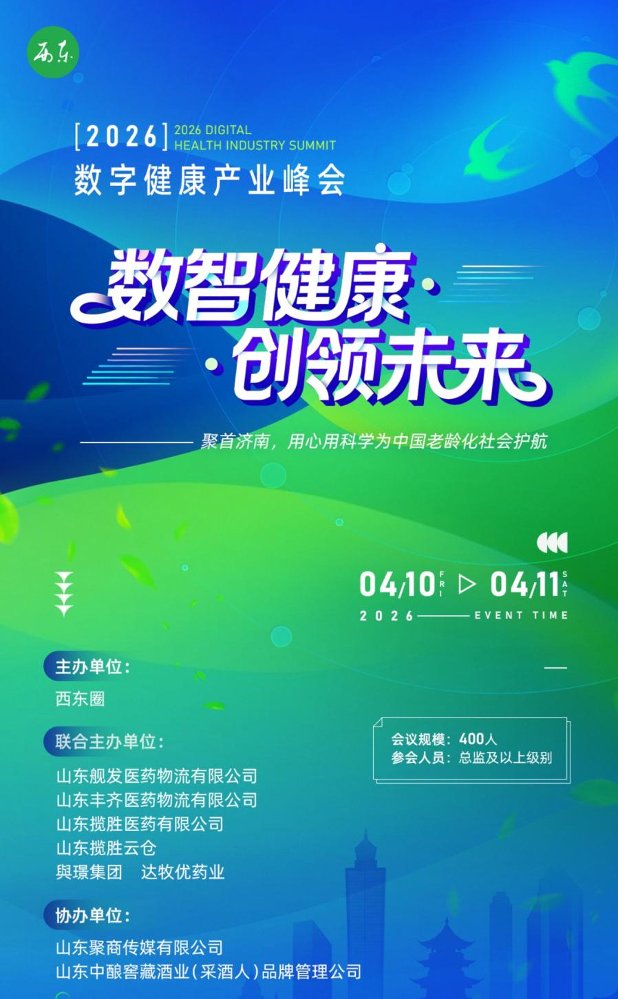 在此背景下,由西东圈主办,山东舰发医药物流有限公司、山东丰齐医药物流有限公司、山东揽胜医药有限公司等多家企业联合主办的“数智健康·创领未来——2026数字健康产业峰会”,将于2026年4月10日至11日在济南绿发希尔顿酒店盛大召开。本次峰会的主题为“聚首济南,用心用科学为中国老龄化社会护航”,旨在汇聚大健康产业上下游核心力量,推动产业的深度融合与创新发展。