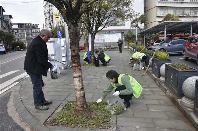 宝坪镇朝阳社区志愿者正在清理路面杂草
