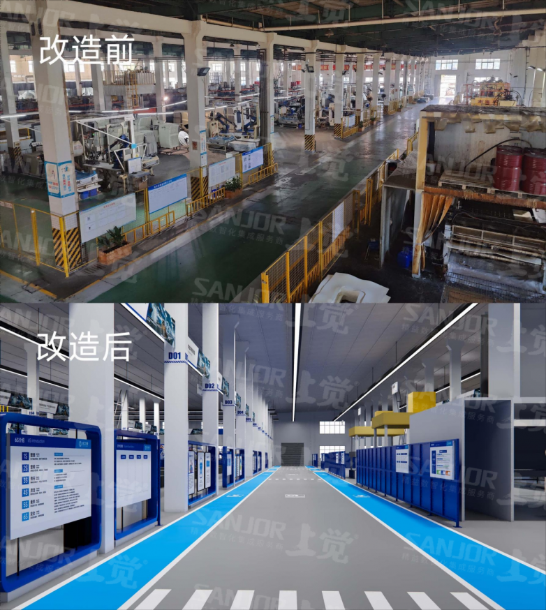 环境氛围“灰头土脸”:陈旧的水泥地面、老式的护栏、模糊的看板,整体环境昏暗,缺乏现代企业应有的精气神。空间利用“粗放低效”:设备布局随意,工作区域与通道划分不明,宝贵的生产空间未被最大化利用。