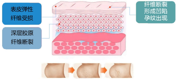 在探讨有效修复方法前,我们首先要明确:妊娠纹的本质,是孕期腹部肌肤被快速拉伸后,真皮层胶原纤维和弹力纤维发生断裂,进而形成的不可逆纹路(初期呈红/紫色,后期逐渐变为白/银色)。目前医学界公认的唯一有效修复方式,并非单一涂抹产品或单纯使用仪器,而是能从根源解决问题的——联合修复疗法,这也是破解妊娠纹修复难题的关键。
