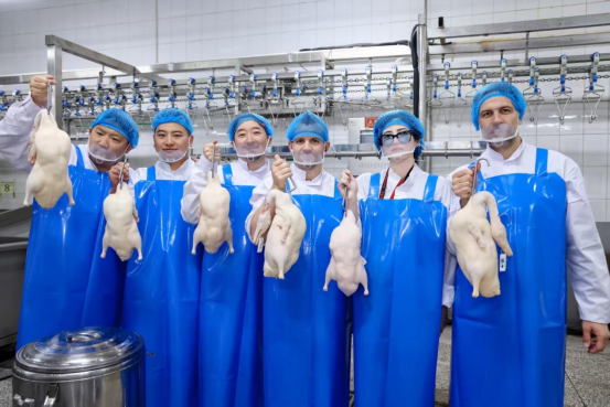 ↑嘉宾们在金星鸭业学习烤鸭鸭胚制作工艺