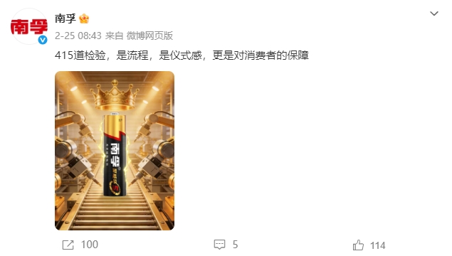 近日,南孚电池官方微博发布了一句掷地有声的分享:“415道检验,是流程,是仪式感,更是对消费者的保障”,简单的一句话,不仅道出了南孚对产品品质的极致追求,更揭开了这个国民电池品牌多年来坚守品质、赢得信赖的核心密码。南孚深耕电池领域多年,始终将品质放在首位,415道检验流程,不是空洞的口号,而是融入生产全流程的严苛标准,是对消费者每一次选择的郑重承诺。
