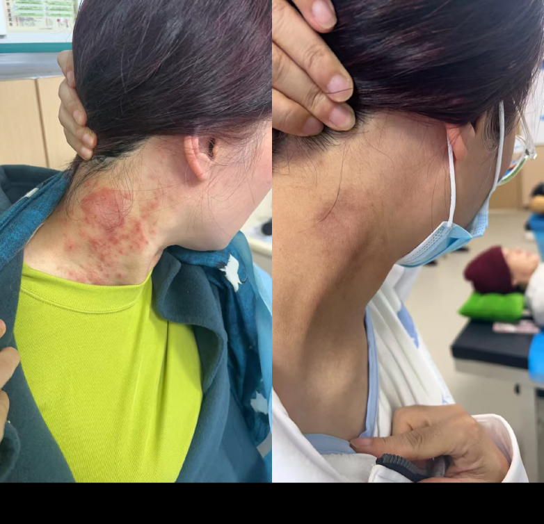 有一位女士,长期被严重过敏性皮疹困扰。脖子、前胸、后背大面积起疹,皮肤又红又肿、又痛又痒,越抓越重,夜间更是痒得无法入睡,生活备受煎熬。
