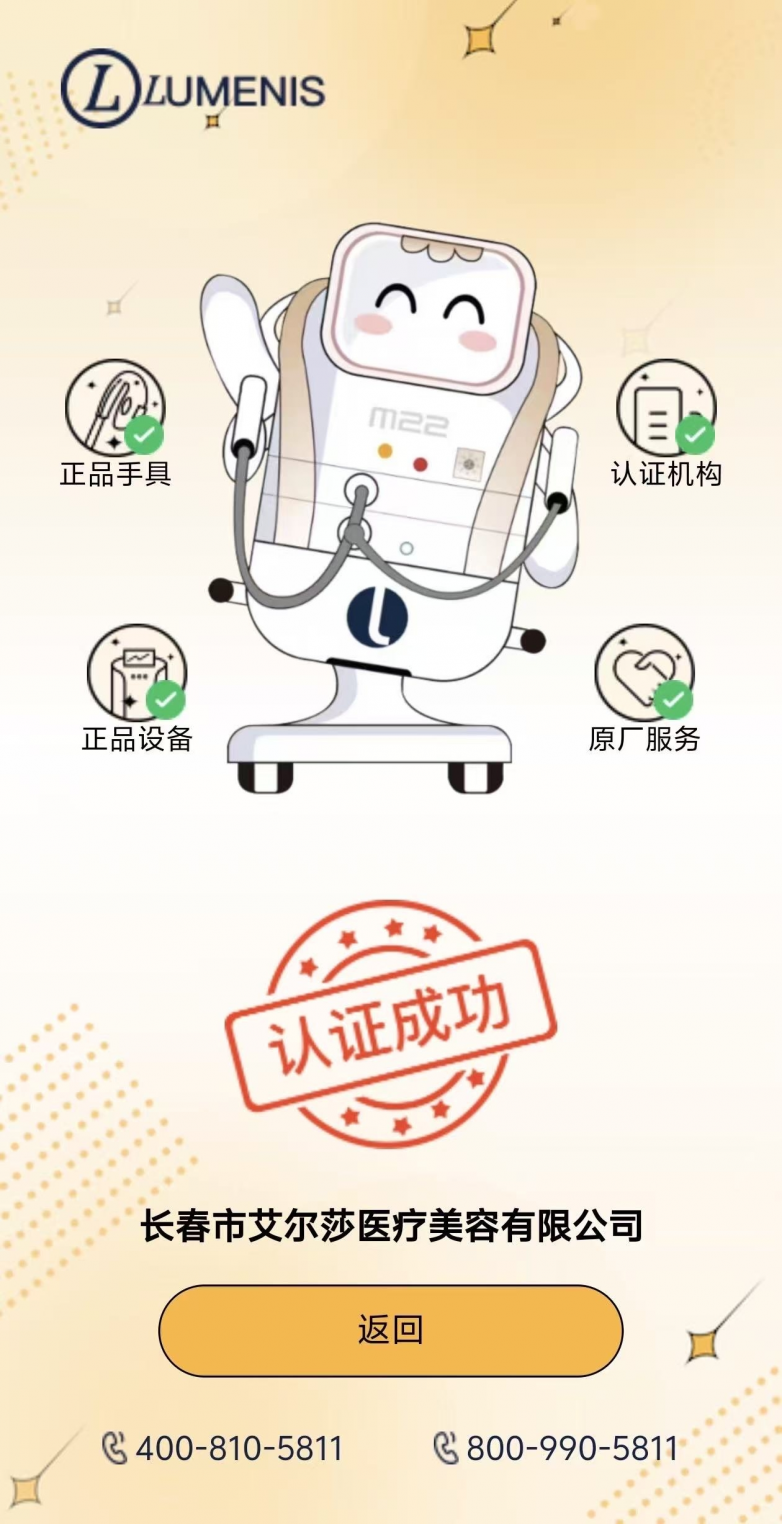 为进一步消除大家的疑虑,艾尔莎同步公开了M22的官方查询认证流程。只需关注“科医人无忧智护”微信公众号,点击“四维验真”,输入机构全称,即可查询机构认证资质、正品设备及正品手具。艾尔莎的M22设备与操作手具均已通过该渠道完成多重验证,全部为正品认证。