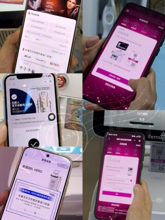 “安全第一”是艾尔莎坚持的原则。机构内陈列着多台国际一线医美仪器,包括大超炮、帝医思黄金微针、超玛吉(射频紧肤)等。每台仪器都经过官方授权,支持现场扫码验真,确保使用的正品仪器。