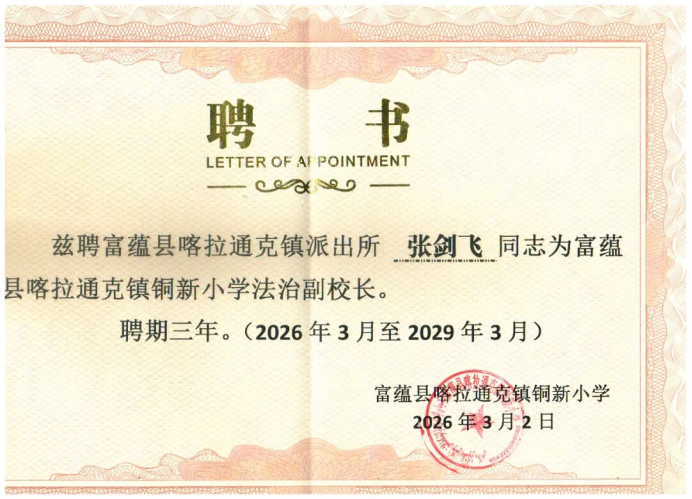 为全面加强青少年法治教育,深化平安校园、法治校园建设,切实筑牢校园安全防护屏障,3月以来富蕴县公安局立足公安职能,精心选派40名政治素质过硬、业务能力突出、责任心强的优秀民警担任辖区中小学、幼儿园法治副校长,通过集中聘任颁证、常态化普法宣讲、全方位隐患排查、制度化联动共治等举措,积极构建全方位、立体化校园安全防护体系,为广大青少年健康成长撑起法治“保护伞”。