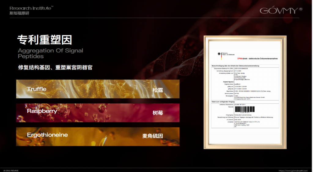 仅供GOVMY澳芙密®品牌宣传与新闻发布使用禁止任何未经授权的商业转载与滥用违者必究科研实力是高端养护产品的核心竞争力,澳芙密的突破首先体现在对前沿生命科学的深度融合与应用。旗下核心养护产品由斯坦福大学顶尖科研团队领衔研发,依托全球顶尖健康科研矩阵与智能化表型分析平台,长期深耕女性内分泌与生殖衰老机制,最终构建起以基因养护体系为核心的技术架构。这一体系的核心价值,在于打破了传统养护“单一调理”的局限,依托双专利核心科技的协同作用,实现从内分泌轴调节到生殖系统关键器官的全链路基因级修护。专利类核心成分与仿生信号肽的精准应用,让养护从“对症缓解”升级为“根源修复”,让每一次调理都具备科学依据与精准导向,为产品的核心功效筑牢了坚实的科研根基。