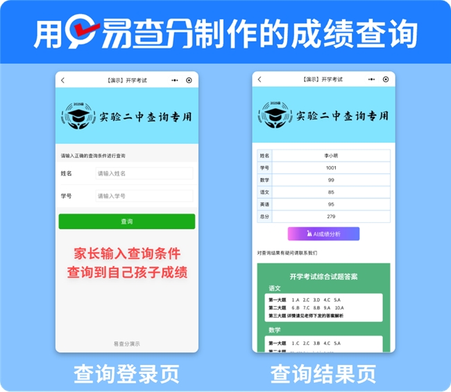 当然,对我们一线班主任来说,日常工作从来都不只是行为积分管理这一件事,每次考完试的成绩统计、学情分析、家校反馈,才是真正耗时耗力的大头。这方面,我一直用易查分,很多年轻老师都被成绩下发和分析搞得头大,担心成绩泄露,给家长一个个私发又太费时间,算平均分、分数段等又不懂函数,,易查分就完美解决了这些问题。永久免费,上传成绩表1分钟就能生成查询入口,家长只能查看自家孩子的成绩,还能AI生成学情分析报告,不用我们手动算数据,省了太多的时间和精力。