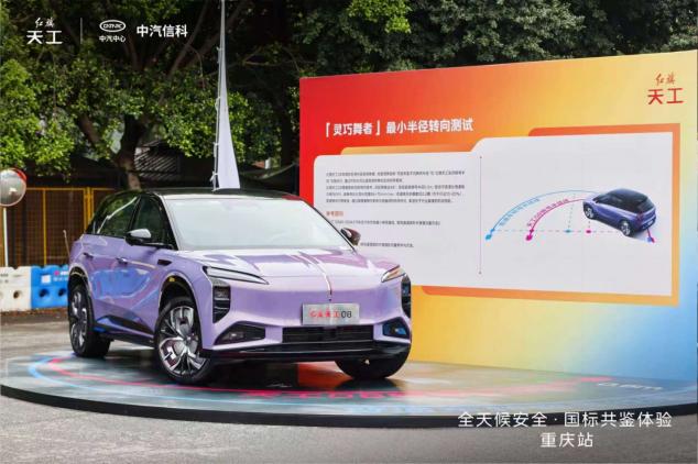 除了坚固,灵巧与关怀同样触手可及。现场通过清晰标注最小转弯半径5.3m,并与国标对比的转弯半径演示,将优异的操控数据转化为在重庆窄巷中“一把掉头”的灵动场景。在健康关怀层面,用户可用高温风枪直吹座椅,亲身验证其在极端环境下的抗变形能力与环保材质的稳定性。