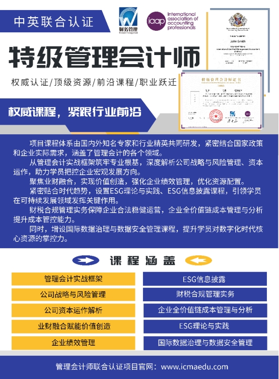 当前,数字经济与实体经济深度融合,企业经营管理面临的市场环境日趋复杂,财务管理的战略价值被提升至全新高度,具备国际视野、实战能力与战略思维的高端管理会计人才,成为企业应对变革、实现可持续发展的核心驱动力。特级管理会计师联合认证依托中英双方权威机构的专业优势,打破本土与国际管理会计人才培养的壁垒,以专业化、国际化、实战化的认证体系,为财务精英搭建起一条兼具权威性与实用性的职业晋升路径,成为推动高端管理会计人才队伍建设、助力行业高质量发展的重要力量。