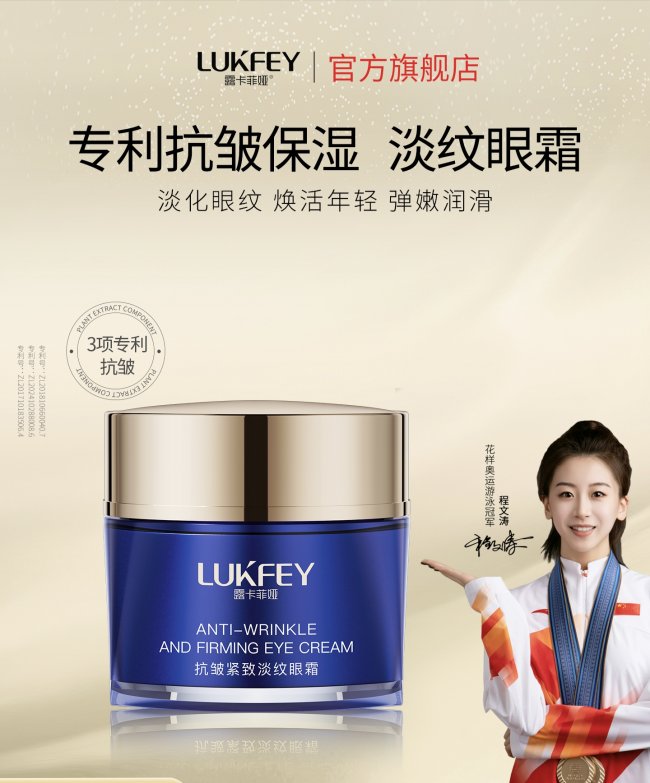 在此背景下,国货护肤新锐品牌露卡菲娅(LUKFEY)凭借深耕护肤领域多年的研发沉淀,重磅推出小蓝瓶淡纹眼霜,以“三重专利配方、双通路淡纹、全周期见效、全肤质适配”的硬核实力,打破国货眼霜“平价低效”的刻板印象,上市即引爆市场,斩获94.2%超高回购率、3000人次全肤质实测适配率达98%的傲人成绩。更值得关注的是,产品力获花样游泳冠军、奥运金牌得主程文涛认可,正式出任品牌代言人,以冠军严苛标准为产品品质背书,共同诠释“专业、高效、卓越”的护肤精神,开启眼周抗老新纪元。