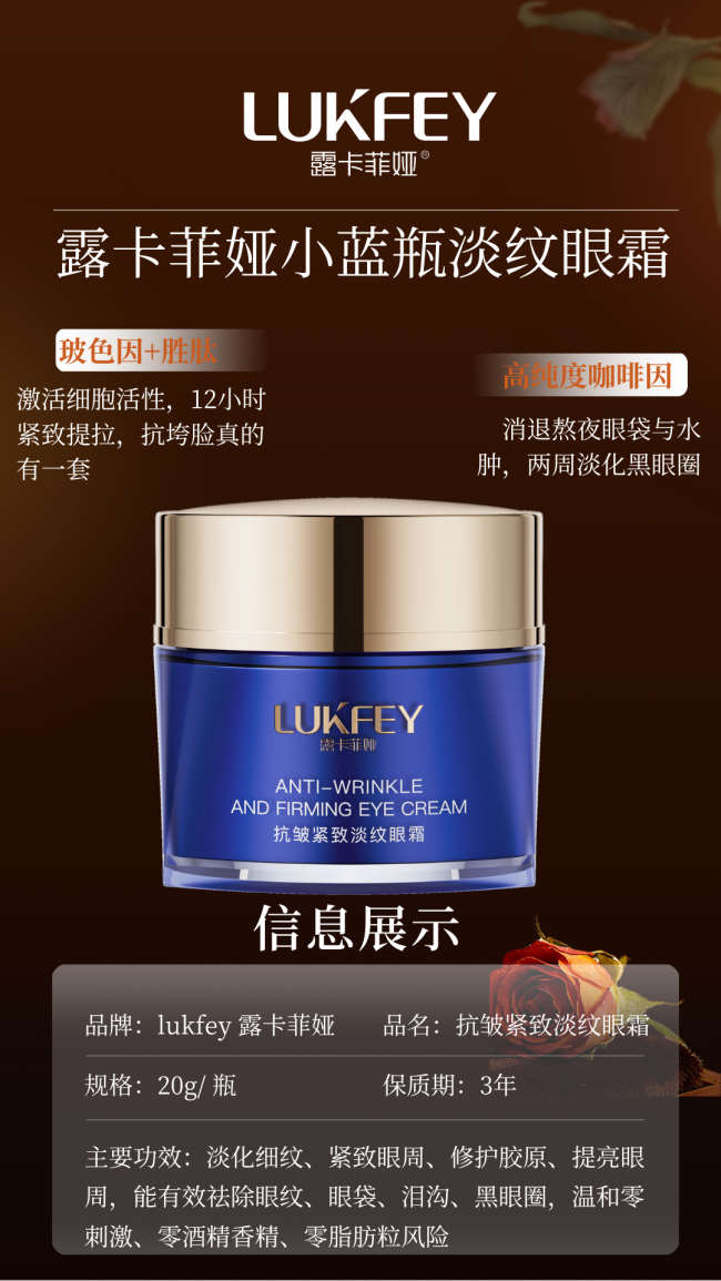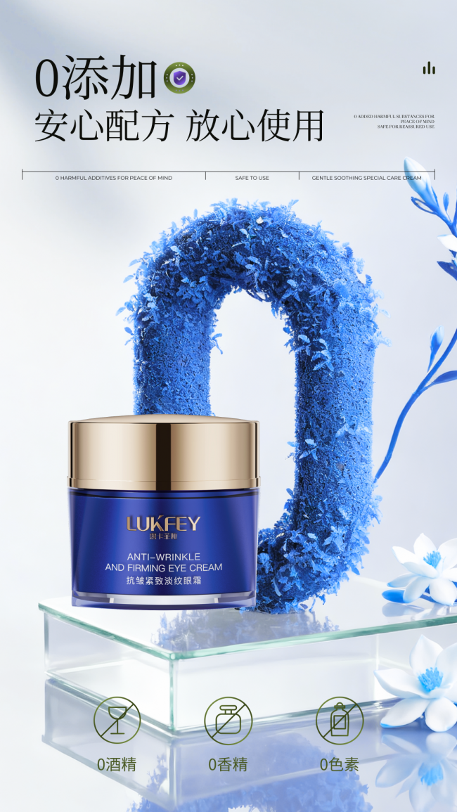 露卡菲娅小蓝瓶淡纹眼霜的核心优势,首先源于其科学严谨、精准高效的配方体系,摒弃传统眼霜“概念添加”的弊端,以“高浓度、高活性、高渗透”为核心,持有三项国家发明专利,从技术源头保障功效落地,构建“动态纹抑制+静态纹填充+肌底修护+浮肿提亮”的全维度抗老闭环。