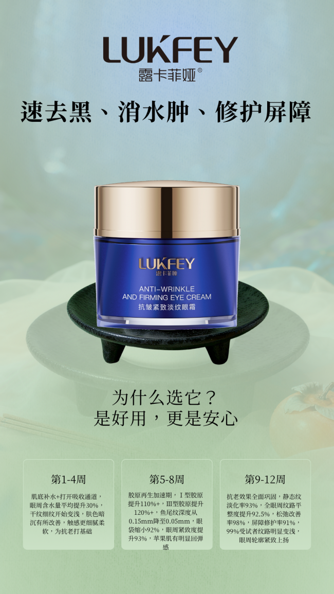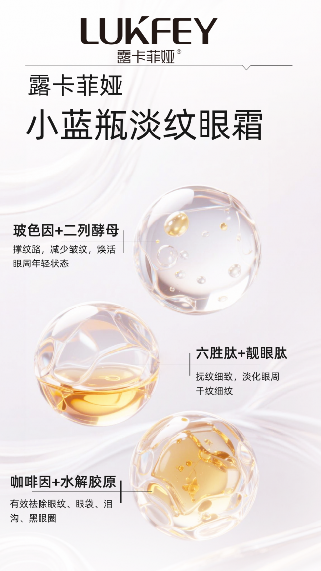 在护肤消费日趋理性、功效为王的当下,露卡菲娅小蓝瓶淡纹眼霜以三重专利配方、双通路淡纹技术、28天分周期见效、全肤质温和适配、冠军权威代言的全维度优势,重新定义了国货眼霜的品质标准,为万千女性提供了一套“科学、高效、安全”的眼周抗老解决方案。