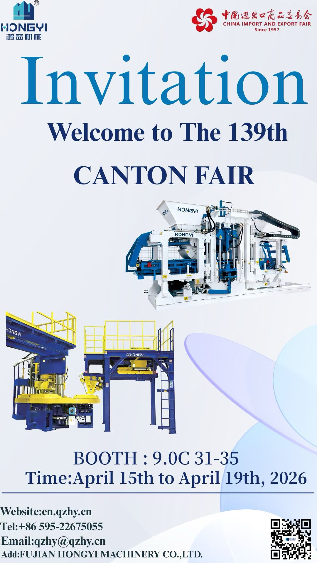 第139届中国进出口商品交易会(广交会)即将于4月15日—19日在广州盛大启幕。作为全球规模最大的综合性国际贸易盛会,本届广交会汇聚海内外优质企业与前沿技术,为中国制造搭建国际化展示与合作平台。福建鸿益机械有限公司携全新智能砌块成型设备重磅参展,以硬核技术与匠心品质亮相9.0C 31-35展位,向全球客商展现中国建材装备的创新实力。