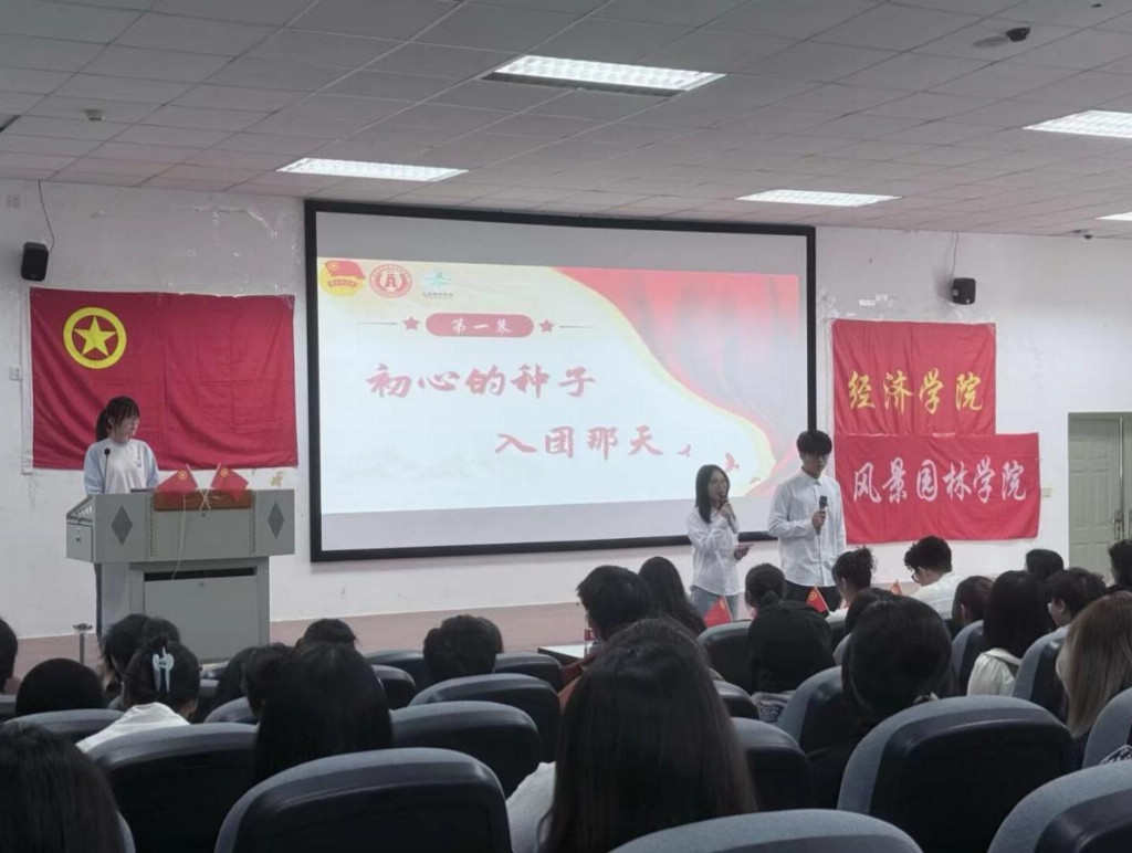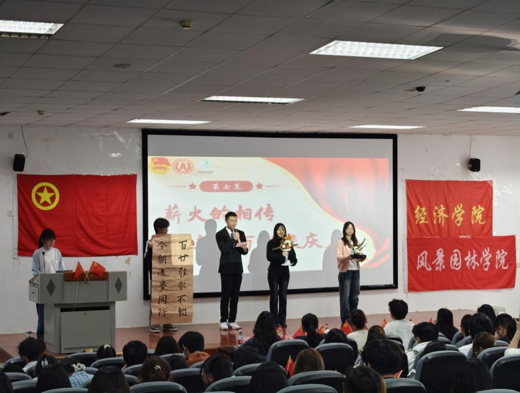 活动邀请经济学院党委办公室宋宸老师、风景园林学院专职团干李阳洋老师等多位嘉宾,与两学院全体团员和青年齐聚一堂,共赴这场兼具时代高度与校史温度的沉浸式精神盛宴。本次活动以沉浸式舞台剧为载体,由两位表演者以跨越今昔、回溯时光的沉浸式对话贯穿全场,紧扣校史传承与时代使命,自然衔接各主题环节脉络,让时代新声与百年校史在场景化演绎中深情共鸣。
