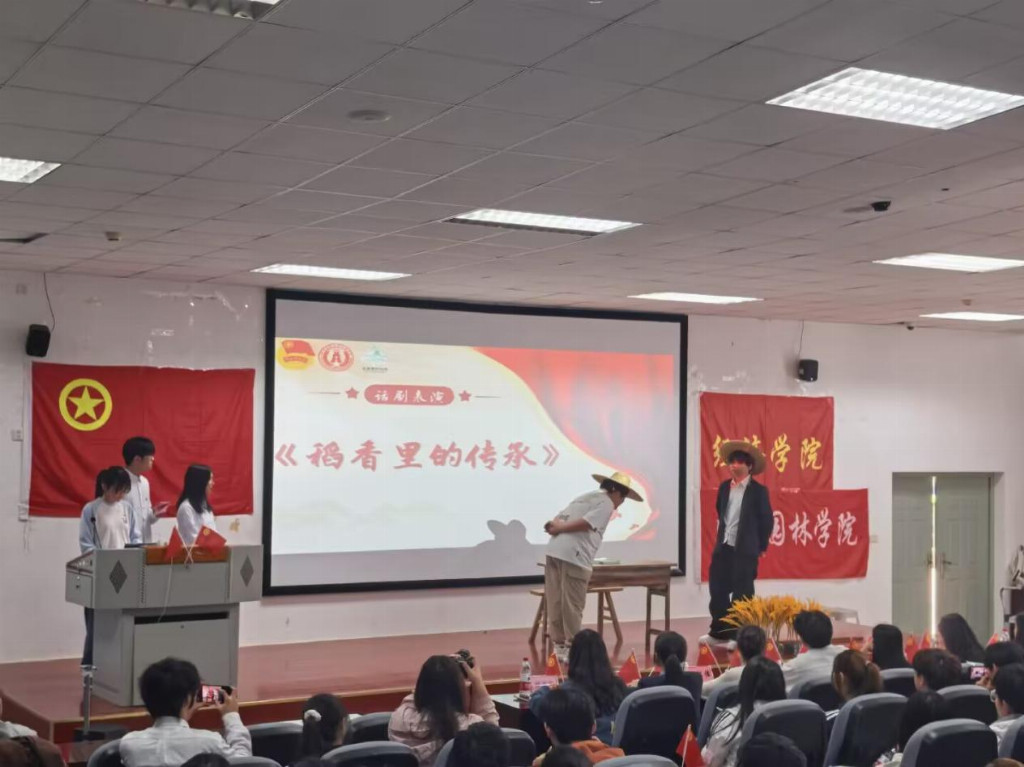 两位主人公以学习国家大方向为契机,与风景园林学院陈诗雨老师进行深度访谈。陈老师立足两学院专业特色,深入解读2026年全国两会核心要义,现场与学子互动交流、答疑解惑,为学子明晰实干方向,点亮兴农初心。访谈尾声,原创话剧《稻香里的传承》温情上演。该剧以周开达院士生平为蓝本,生动再现其一生躬耕稻田、矢志育种的坚守,传递“为国育种、为民解忧”的赤子初心与科学家精神,激励青年学子以先辈为炬,深耕三农沃土、续写兴农华章。