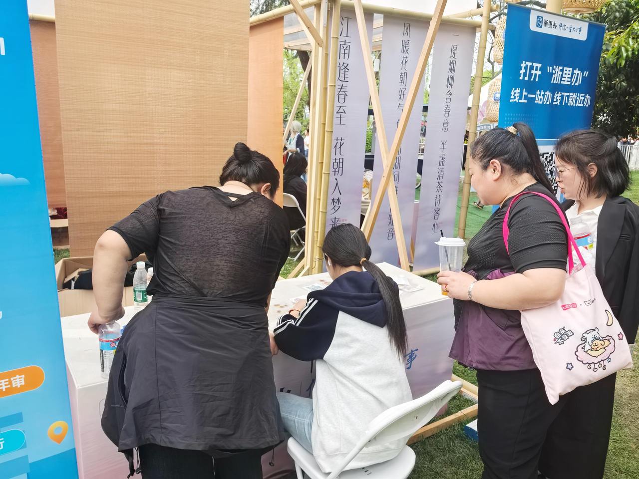 浙里办杭州城市频道特设专属展位,以互动体验、趣味打卡、便民咨询相结合的形式,将政务服务、生活服务、文旅服务、就业服务等一站式数字化功能带到市民与游客身边,让数字便民与宋韵花朝相融共生。