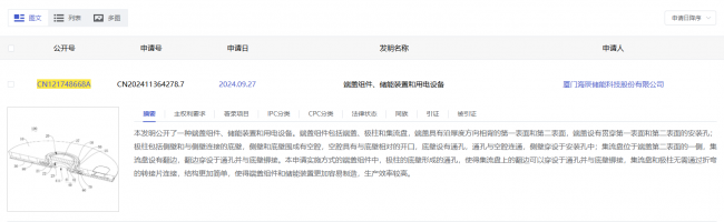 国家知识产权局官方信息显示,厦门海辰储能科技股份有限公司(简称“海辰储能”)申请了一项发明专利,专利名称为“端盖组件、储能装置和用电设备”,公开号为CN121748668A,申请日期为2024年9月。