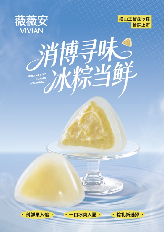 2023年消博会上,薇薇安首款猫山王榴莲冰粽一经亮相便引爆全场,凭借「垂直创新、鲜食为本」实力出圈,收获全国消费者的口碑与喜爱。历经5年经典沉淀,今年盛夏强势回归,不仅是冰爽沁心的新式端午粽礼,更是逛展必吃的清凉甜意!