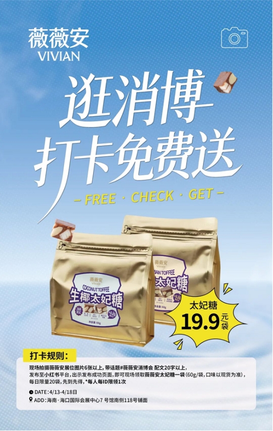薇薇安在第六届中国国际消费品博览会与所有「薇宝们」线下赴约消博会期间,前往薇薇安展位打卡即可免费领取薇薇安太妃糖一袋!