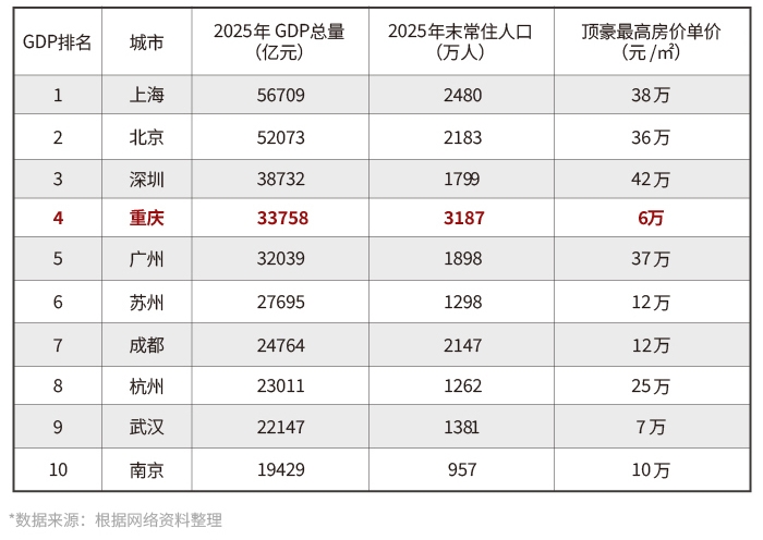 资产的天花板,由城市的财富蓄水池决定。2025年,重庆GDP突破3.3万亿元,蝉联“中国经济第四城”。作为一带一路、西部大开发、成渝双城经济圈等多项的交汇点,重庆不仅是全球供应链的重要节点,在国家安全备份与产业战略布局中也具有不可替代的地位,城市发展潜力充沛。