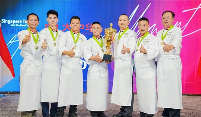 峰会现场气氛热烈,舞台背景上的“大中华”字样与多国国旗交相辉映,象征着中餐文化的多元融合与国际交流。在团队合影环节,中国厨师们身着统一的白色厨师服,佩戴象征荣誉的绿色勋章绶带,手捧金光闪闪的奖杯,自信地竖起大拇指,定格下这一荣耀时刻。他们的专业风采与昂扬姿态,赢得了现场与会嘉宾的阵阵掌声。