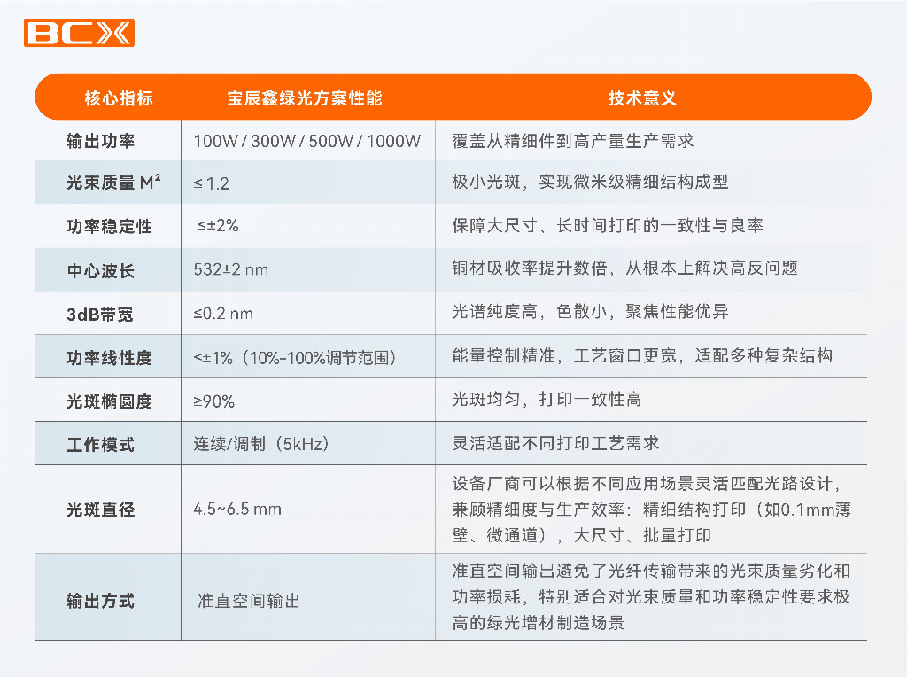 宝辰鑫此次推出的BFSC 100G-1000G系列单模绿光连续光源方案,波长范围为532nm。从物理本质上,铜等高反材料对532nm绿光的吸收率远高于常规光纤激光,为实现稳定、高效的纯铜3D打印提供了基础。
