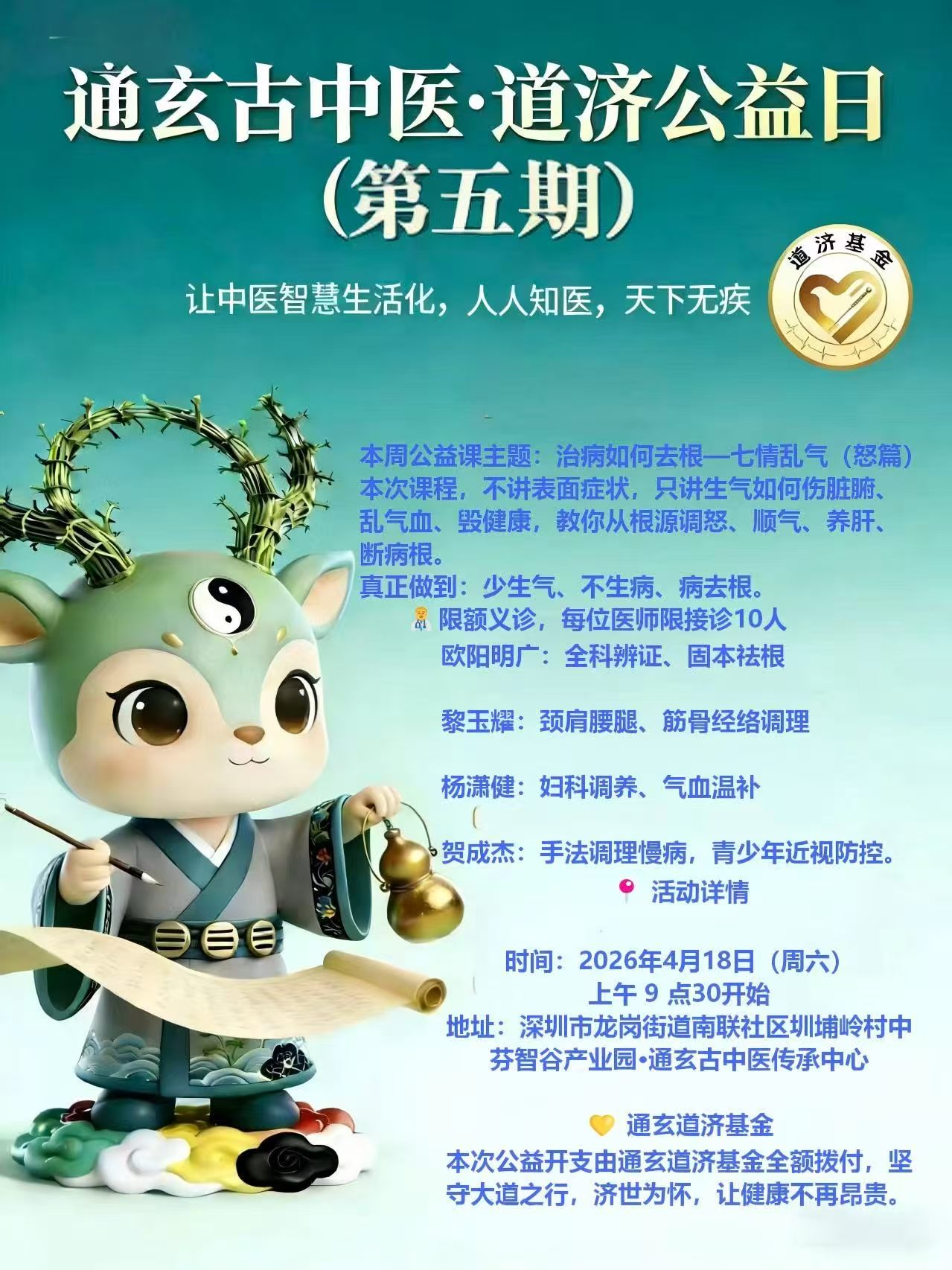 2026年4月,深圳 —— 在刚刚过去的通玄古中医“道济公益日”活动现场,一只通体松石绿、颈系葫芦香囊的小鹿悄然成为焦点。它时而捧杯泡脚,时而趴在工位上“摸鱼”,时而又站在山顶许愿“天下无疾”——它就是通玄古中医道济公益日的专属吉祥物:玄鹿济济。