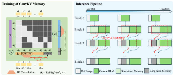 在训练策略上,Soul X-LiveAct的目标不仅是追求视频质量,更是显式对齐流式推理的长时误差传播。Neighbor Forcing对齐训练分布,强制模型在同扩散步语境下接收来自相邻帧的条件latent,减少AR链中跨步噪声空间不一致带来的优化震荡。长时一致性导向的自回归训练构造按chunk方式组织训练样本,显式覆盖连续chunk合成、误差累积与再纠正的过程,让模型在训练期就暴露并学习处理长时漂移问题。Memory-Aware训练引入与推理一致的ConvKV Memory使用方式,让模型学会在被压缩的历史记忆条件下保持身份与细节一致性,避免训练与推理不一致导致的性能下降。