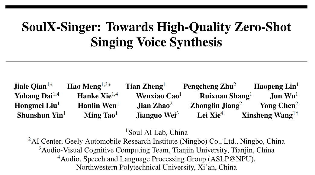 SVS(歌唱语音合成)不同于普通语音合成,它需要对音高、音律及演唱风格进行精细控制,以实现自然且富有表现力的歌声输出。为填补行业空白,Soul App AI 团队(Soul AI Lab)联合吉利汽车研究院人工智能中心(AIC)、天津大学视听觉认知计算团队和西北工业大学音频语音与语言处理研究组(ASLP@NPU),共同研发并开源了SoulX-Singer模型。其核心目标是在未见过歌手音色的情况下,实现稳定、自然且高度可控的歌声生成。