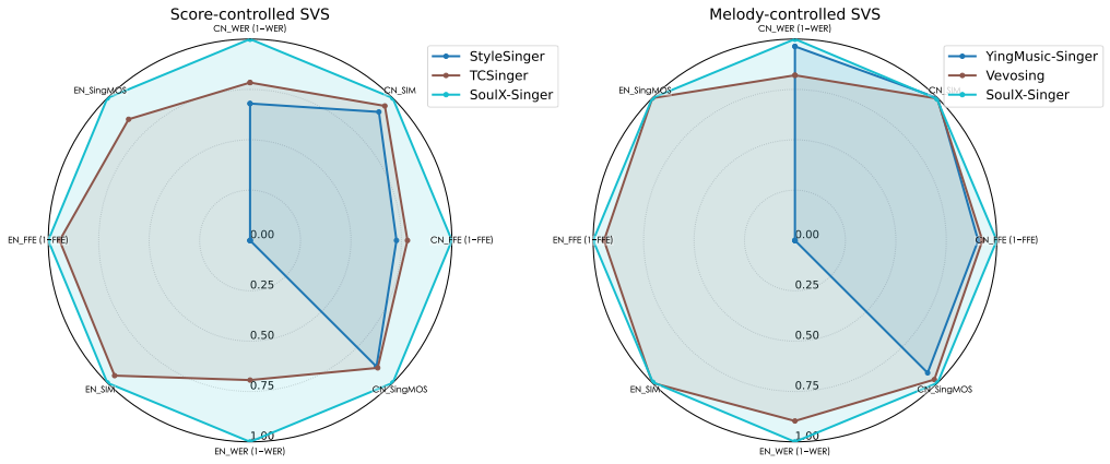 目前,SoulX-Singer已支持普通话、英语、粤语三种语言,且在不同风格下均能保持稳定质量,为其在内容创作、虚拟歌手、互动娱乐等领域的落地拓展了广阔空间。为验证模型性能,团队在GMO-SVS和SoulX-Singer-Eval两个数据集上开展系统评测,其中前者整合了多个主流开源SVS数据集,后者则专门针对零样本场景构建,确保测试歌手未出现在训练集中。评测结果显示,SoulX-Singer在语义清晰度、歌手相似度、基频一致性及整体合成质量上均显著优于同类模型,主观听感评测也取得了领先优势。