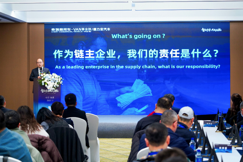 杨峻岭在奇瑞商用车2026合作伙伴大会VAN事业部分会场发表演讲,阐述奇瑞商用车VAN业务的产品与技术布局