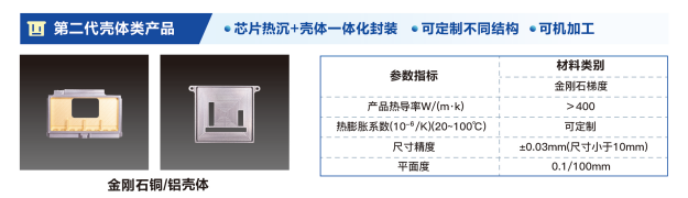第二代:壳体类产品:第二代产品创新采用芯片热沉+壳体一体化封装技术,减小热阻并省去一道焊接工序,在小型化集成化方面实现突破;