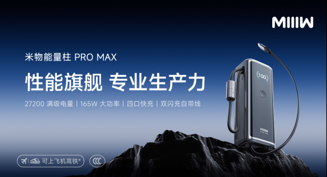 2026 年 4 月 24 日,米物科技正式推出旗舰级高性能充电宝——能量柱 Pro Max,以 165W 顶级功率、27200mAh 超大容量、双线全能设计与全场景安全防护,重点满足户外摄影、专业创作、商务差旅等高频用电需求,用专业级移动补能方案开启全民充电升级时代。