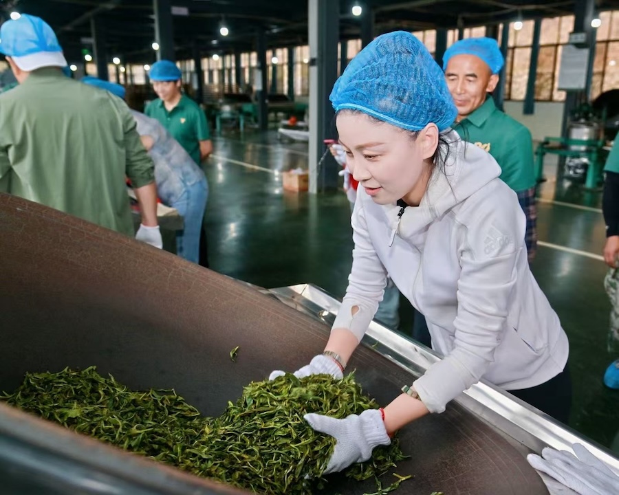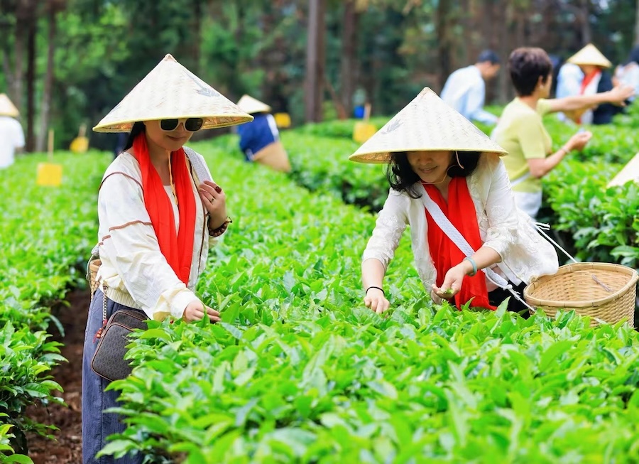 参与活动人员体验茶叶采摘(4月23日摄)。
