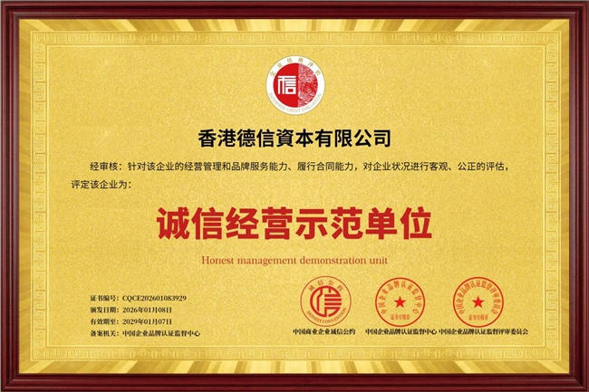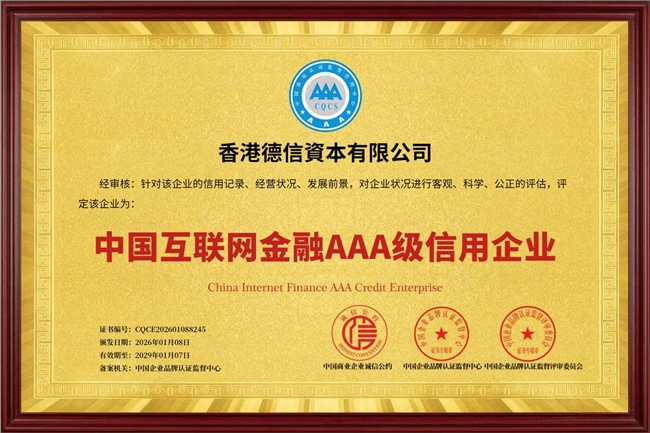 自正式进入中国市场以来,德信资本以优异的表现赢得了多方认可。公司荣获《全国投资行业质量、信誉AAA级诚信企业》、《中国互联网金融AAA级信用企业》以及《诚信经营示范单位》等多项殊荣,充分证明了其在行业中的领先地位和良好信誉。这些荣誉均经过国家权威机构严格审查,彰显了德信资本的合法合规运营和优质服务。
