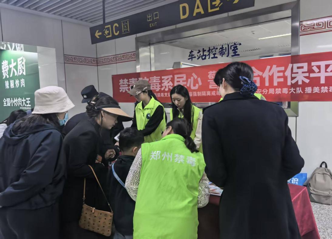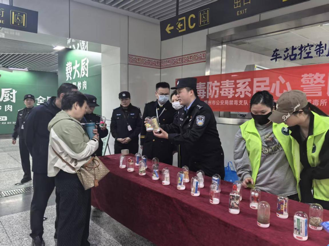 “这不是普通的奶茶粉吗?竟然是伪装的新型毒品!”4月10日,郑州市公安局禁毒支队、郑东新区禁毒大队联合郑州市公安局地铁分局第一派出所、白庙强制隔离戒毒所、播美禁毒社工、全人社工,在东风南路地铁站人流密集的出入口开展禁毒宣传活动,宣传摊位前围满了驻足的乘客,禁毒民警与社工正通过仿真毒品模型,为过往群众上了一堂生动的“沉浸式”禁毒宣传课,让禁毒知识走进出行日常。