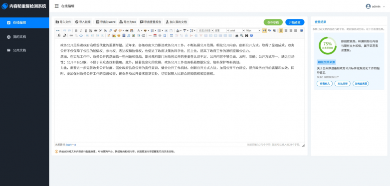 一是全域深度查重,支持网站群、政务新媒体矩阵、内部文档数据库之间的交叉比对,并能精准定位与上级单位、其他地区单位、本单位历史发布内容的相似片段;