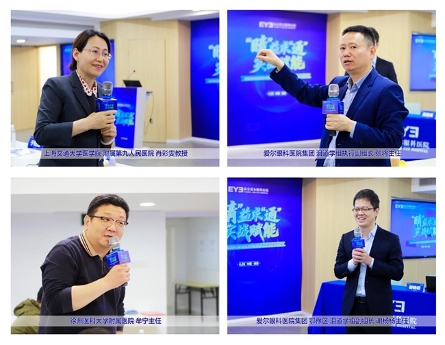 其中,上海交通大学医学院附属第九人民医院肖彩雯教授、爱尔眼科医院集团泪道学组执行副组长张将主任、鄂豫区泪道学组副组长谢杨杨主任、宁波爱尔光明眼科医院章晓林主任,分别围绕上泪道阻塞治疗、泪道旁路手术临床探索、顺行泪道置管手术技巧、泪道阻塞与眼表表型等核心主题展开深度分享。