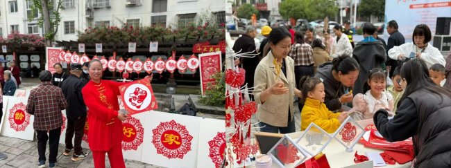 传统剪纸老师现场示范折叠、裁剪技巧,小动物、花朵等图案在指尖轻松成型。大人孩子齐动手,剪刀起落间,一张张彩纸变成精美作品,充满创意与乐趣。