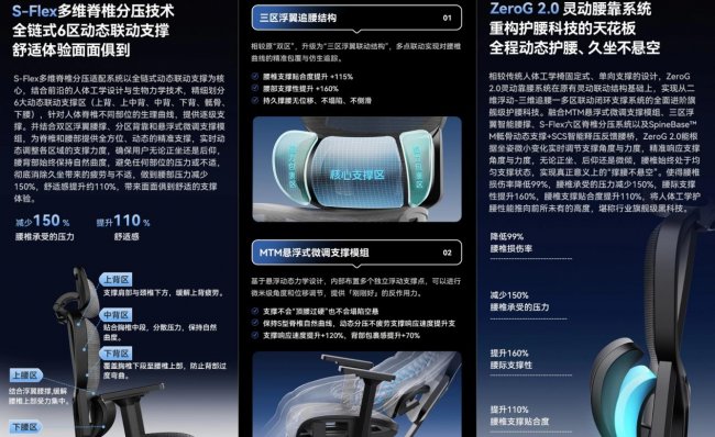 为了解决这一问题,夏草木从底层结构入手,构建了以“动态支撑”为核心的设计思路,并在夏草木Fit2中实现突破。Fit2采用了全新的ZeroG 2.0灵动腰靠系统与三区浮翼追腰设计,结合S-Flex六区分压技术,形成了完整的支撑闭环。此设计能够根据坐姿的微小变化自动调整支撑区域,避免传统椅子的“支撑断点”,从而提供全方位的动态支撑,使长时间坐姿中的舒适感更加均衡和持续。