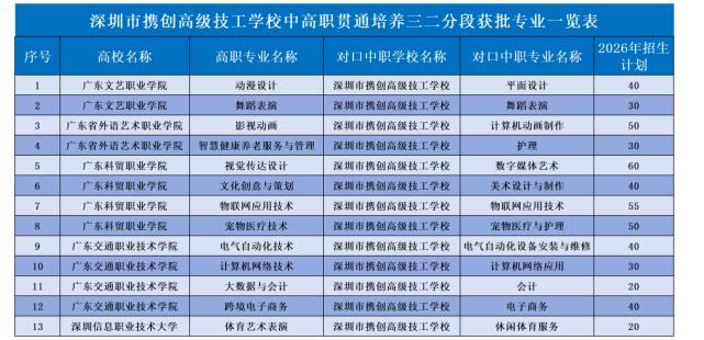 尤为重要的是,深圳市携创高级技工学校在“三二分段”中高职贯通培养领域已建立起显著优势。作为深圳市乃至广东省在该领域的领跑者之一,学校本年度获批的“三二分段”合作专业数量、招生计划规模及专业方向覆盖面均位居前列,并与包括广东交通职业技术学院、深圳信息职业技术大学、广东文艺职业学院、广东科贸职业学院等在内的多所省内顶尖优质高职院校建立了深度、稳固的合作关系,构成了强大的合作高校矩阵。这些院校在各自领域实力雄厚、声誉卓著,它们的鼎力支持是携创办学质量与信誉的最有力背书。据统计,学校提供的“三二分段”学位数在相关计划中占有重要比重,为数以千计的学子直接打开了通往优质高等职业教育的大门。这种“强强联手”的协同育人模式,共同构建了坚实的人才培养“立交桥”。
